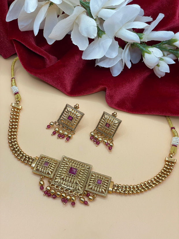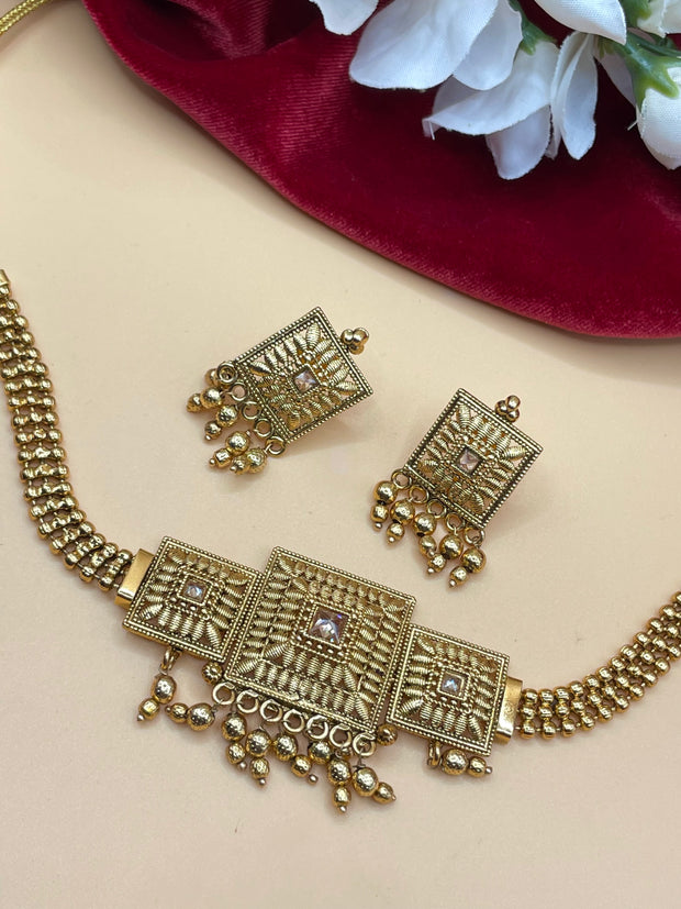 This high quality golden set with high quality gold plated comes with earrings super light weight with adjustable size string for necklace