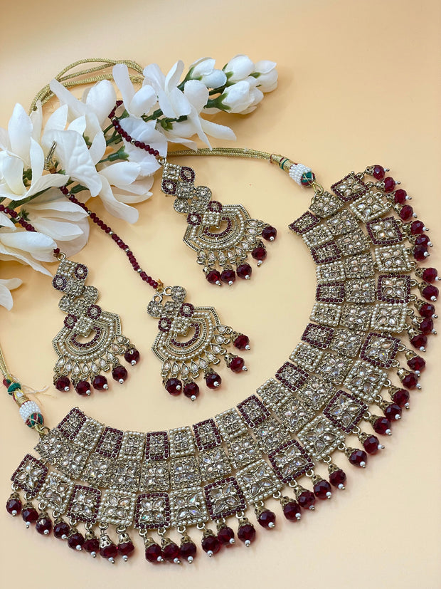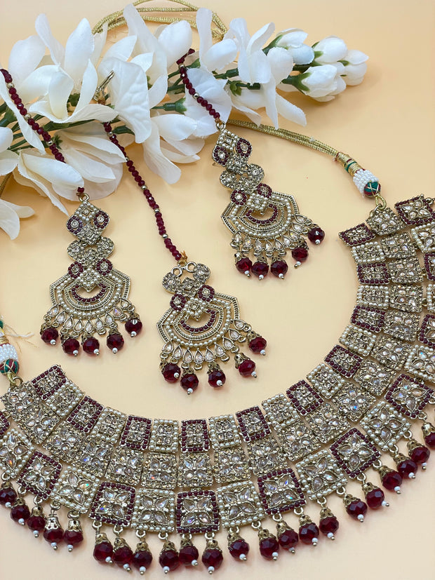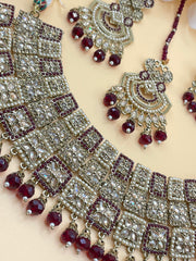 Beautiful mehandi polish Indulge in the timeless elegance of our Anguri Maroon Polki Indina Choker set. This semi bridal set features a rich maroon color that will add a touch of sophistication to any outfit. Perfect for special occasions and everyday wear, this set will make you feel confident and glamorous.Maroon Polki Choker set with drop Glass crystal pearls ..
