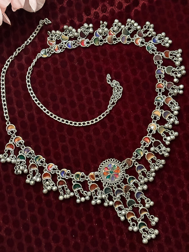 This Oxidised waist belt is sure to give you an edge in style! The stunning belt is made of majestic oxidised metal for a captivating, eye-catching look. Look your best and experience the undeniable confidence that comes with wearing a beautiful waist belt. Feel beautiful and bold - get yours today!