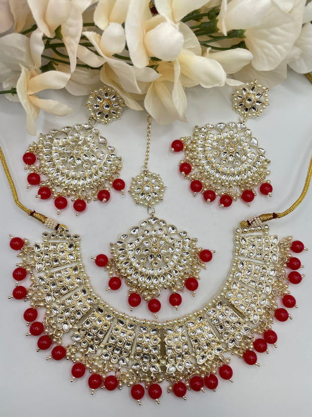 Our Red Kundan Choker Set with Tikka earrings is able to bring you a great look. Exquisite and compact design, not only reduces the burden you wear but also is easy to carry. It is totally made by hand with our full sincerity, so don't hesitate to send it to the one you love. The perfect accessory to add just the right amount of colorful flair to any outfit.