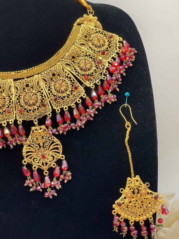 - Beautiful Red Gold Platted Necklace set comes with Tikka Earring.